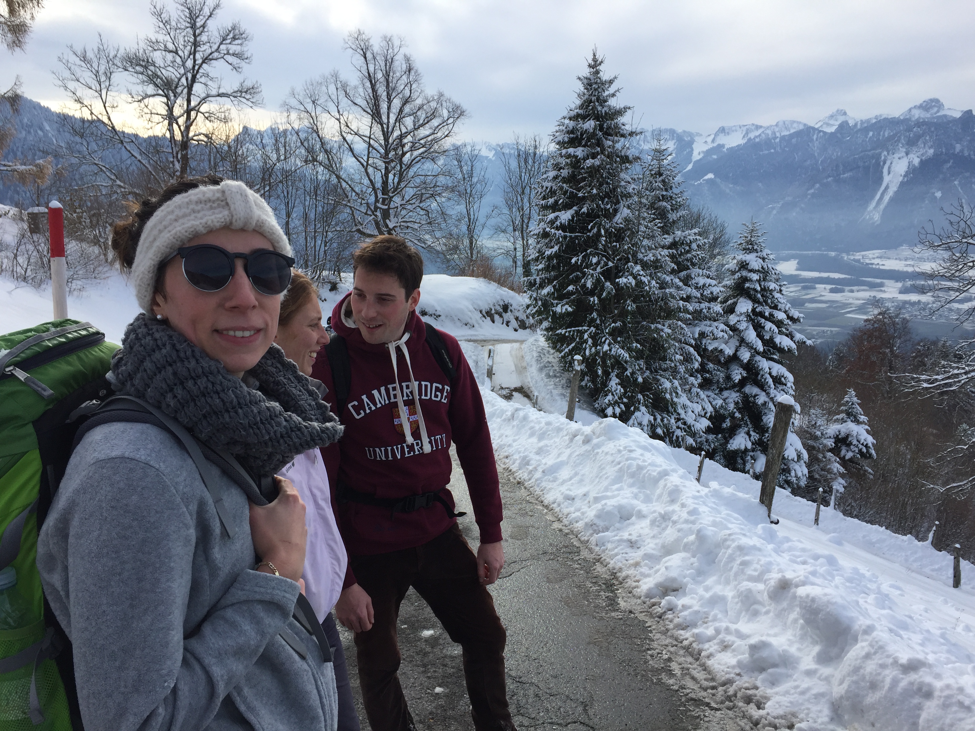 Après la messe, des collaborateurs de la paroisse nous offrent des boissons chaudes à la cure, suite à quoi nous entamons notre ascension en direction de Sonchaux. Nous traversons d’abord les vignes faiblement enneigées, puis choisissons un itinéraire assez raide pour rejoindre notre objectif, afin de profiter des rayons de soleil qui y sont plus présents, et éclairent Montreux de leur lumière pâle en ces heures matinales. La suite de la montée se fera dans la forêt et sur une couche de neige toujours plus épaisse.