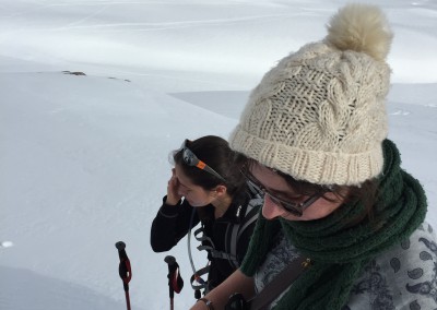 Les 200 premiers mètres de descente se font dans de la bonne poudre, qui à mesure de la descente devient de plus en plus lourde, et ça nous fait bien les cuisses…! Petit virage ici, petit virage là, chutes fréquentes aussi vu que la neige est lourde (excuses,excuses…). Le brouillard ne semble pas s’installer, on bénéficie même d’une légère amélioration sur la fin de la descente. Nous arrivons en bas vers 13h30, et prenons un petit lift pour remonter au téléphérique accrochés à 1, 2 voire même par paquet de 3, (le paquet de 3 n’a pas réussi à arriver jusqu’en haut :)) pour ensuite redescendre…à une petite cabane, afin de manger un bout quand même. Le manque d’énergie se fait sentir! On est bien accueillis, même si nous venons avec notre pique-nique. Antoine à même pensé a emporter une bouteille de blanc valaisan, c’est un pique-nique de luxe.
