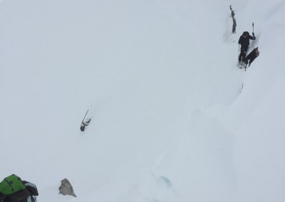 Nous arrivons enfin en vue de la Frühstücksplatz, ce qui est déjà une 1ère étape. Frühstücksplatz d’ailleurs ça veut dire la place du petit-déjeuner…! Ben tiens. Ca tombe justement bien, on en profite pour faire une pause Schoggi, Gipfeli et compagnie, qui redonne de l’énergie aux plus faiblards et aux malades de la montagne. Le passage dans lequel nous nous lançons est étroit et raide, à gauche un mur de neige, à droite le vide dans la pente, et en face le col a atteindre! Pour cela, nous mettons les couteaux, et nous nous séparons en deux groupes. C’est spectaculaire!